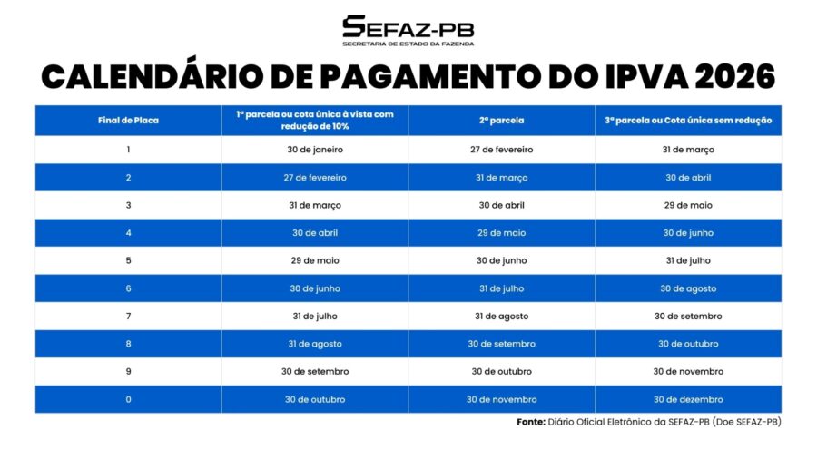 A Secretaria de Estado da Fazenda (Sefaz-PB) já liberou a emissão do boleto da placa com final 1 do IPVA (Imposto sobre a Propriedade de Veículos Automotores) para efetuar o pagamento do exercício de 2026. Os proprietários de veículos no Estado da Paraíba com placa final 1 já podem emitir o boleto do IPVA no […]