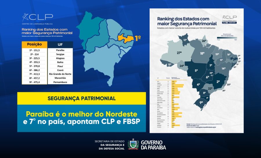 A Paraíba foi reconhecida pelo Centro de Liderança Pública (CLP) como o estado com a melhor Segurança Patrimonial do Nordeste e a sétima melhor do Brasil, conforme o Ranking de Competitividade dos Estados 2025. O levantamento utiliza dados do Fórum Brasileiro de Segurança Pública (FBSP) e considera o volume de roubos totais por 100 mil […]
