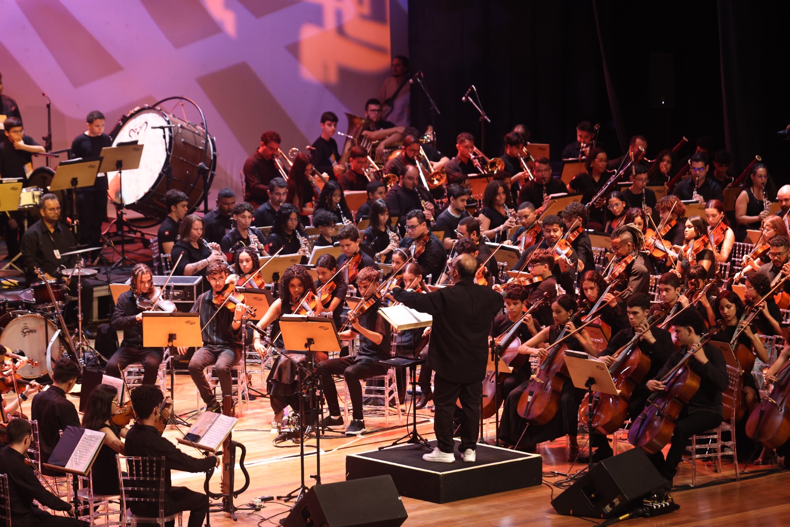 Repertório – O concerto foi estruturado por momentos. No primeiro, a orquestra formada só por alunos do programa tocou seis músicas que são: Symphony № 1, de Gustav Mahler; Aragonaise, de Geordes Bizet; New World Symphony, de Atonin Dvorak; Coisa № 1, de Moacir Santos; Floresta Azul, de Letieres Leite e um Pout – Pourri Natalino, de Folk Song.