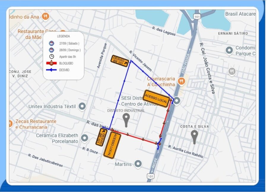 Durante o bloqueio, de acordo com informações do gestor da obra, o engenheiro Francisco Romário, haverá um desvio na BR-101 pelo lado direito, com aproximadamente 50 metros de comprimento, no sentido João Pessoa/Recife. Ele acrescenta que parte da Avenida das Indústrias, no Bairro das Indústrias, no sentido BR-101, também será interditada. “O percurso seguirá pela Rua Agricultor Almerindo Luiz da Silva e pela Avenida Chesf, no Distrito”, explicou.