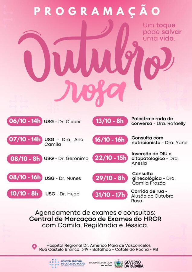 O Hospital Regional Dr. Américo Maia de Vasconcelos, unidade do Governo da Paraíba em Catolé do Rocha, realiza entre os dias 6 e 31 de outubro, uma série de ações alusivas à campanha Outubro Rosa. A programação inclui a oferta gratuita de exames, consultas, palestras, procedimentos e até uma corrida de rua, reforçando o compromisso da Secretaria de Estado da Saúde (SES) com a prevenção e o diagnóstico precoce do câncer de mama e de outras doenças que afetam a saúde da mulher.