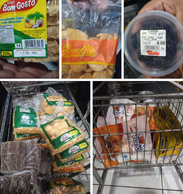 O Procon-JP apreendeu produtos como biscoitos (11 unidades de 250g), tareco (duas unidades de 250g), rapadura de cana de açúcar (13 unidades), uma unidade de doce (250g), uma unidade de milho de pipoca (100g), ameixa seca (15 unidades de 158g), pão de queijo (sete unidades de 300g) e uma caixa de fermento com 45 unidades.