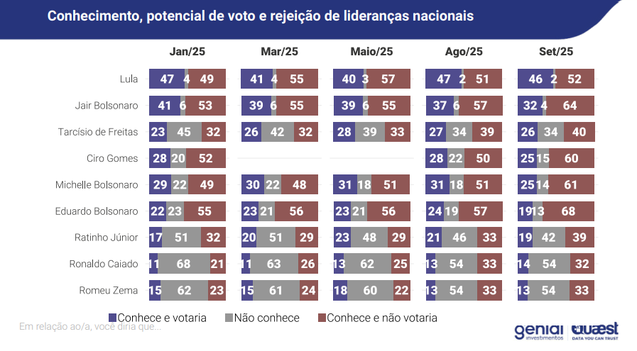 A pesquisa indicou que a rejeição a Jair Bolsonaro saltou de 57% em agosto para 64% em setembro, um crescimento expressivo em apenas um mês. A ex-primeira-dama Michelle Bolsonaro também viu sua rejeição subir consideravelmente, passando de 51% para 61%. O deputado federal Eduardo Bolsonaro registrou a maior alta: sua rejeição passou de 57% para 68%, consolidando-se como um dos políticos mais rejeitados do cenário nacional atualmente.