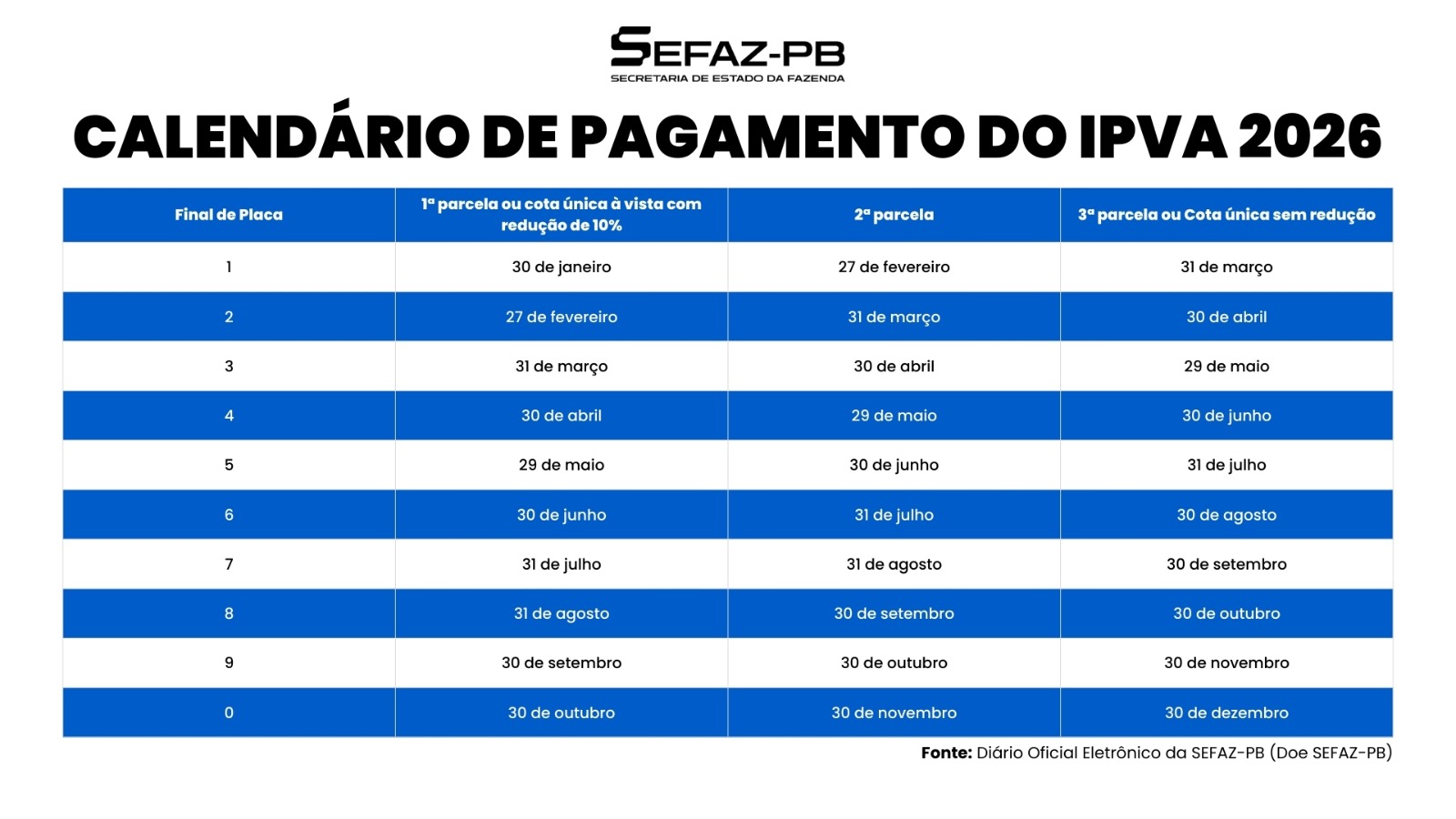 A Secretaria de Estado da Fazenda (Sefaz-PB) já liberou a emissão do boleto da placa com final 1 do IPVA (Imposto sobre a Propriedade de Veículos Automotores) para efetuar o pagamento do exercício de 2026. Os proprietários de veículos no Estado da Paraíba com placa final 1 já podem emitir o boleto do IPVA no portal da Sefaz-PB, por meio do link https://www.sefaz.pb.gov.br/servirtual/ipva/emitir-dar