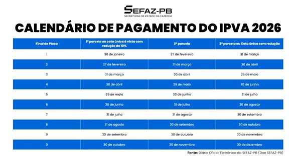 A Secretaria de Estado da Fazenda (Sefaz-PB) publicou, no Diário Oficial Eletrônico (Doe-Sefaz), o calendário de pagamento do Imposto sobre a Propriedade de Veículos Automotores (IPVA), referente ao ano de 2026, sem mudanças nas regras. A portaria do calendário foi assinada pelo secretário da Sefaz-PB, Marialvo Laureano.